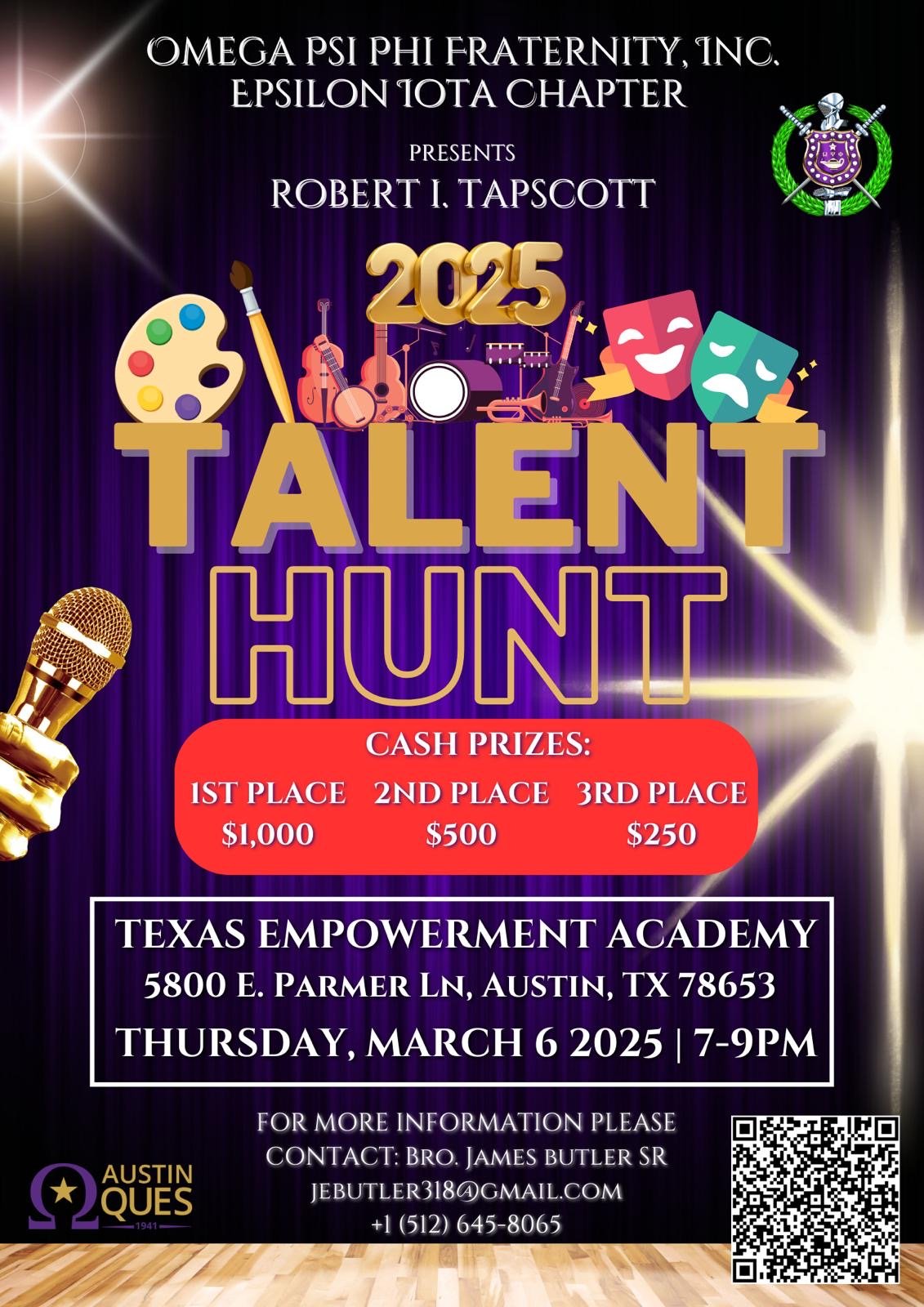 The 2025 Talent Hunt Competition will be held in person on March 6, 2025, from 7 PM to 9 PM at Texas Empowerment Academy (5800 E. Palmer LN, Austin, TX 78653). We seek to highlight the exceptional talents of performing arts students in our community and would love to have at least six of your top-performing students apply.